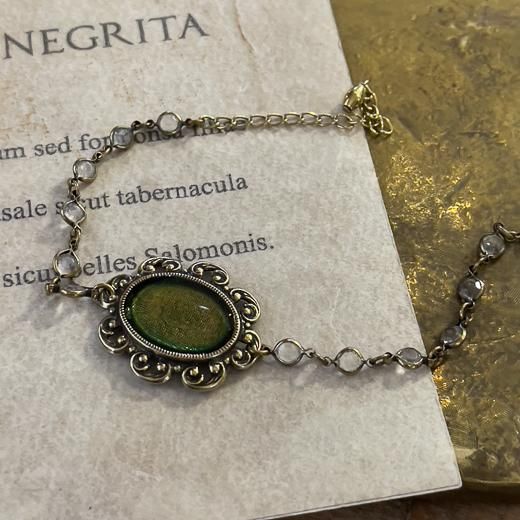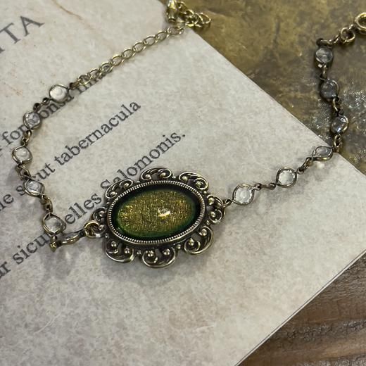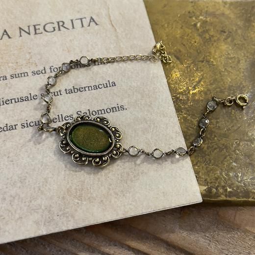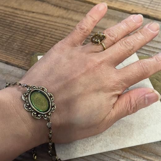 緑の樹脂のフレームにヴィンテージの樹脂パーツを使ってブレスに仕立てました。