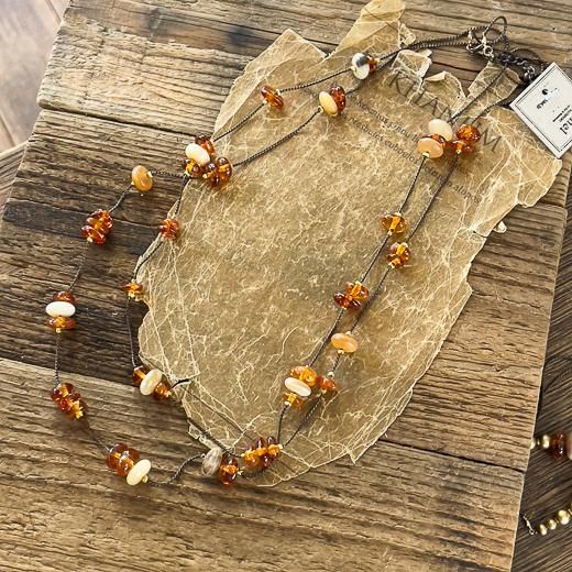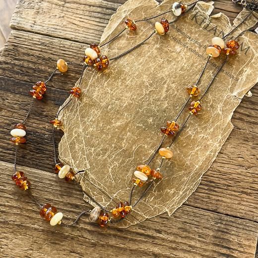 ヴィンテージの古い硝子とメタルパーツ、樹脂のロングネックレス。