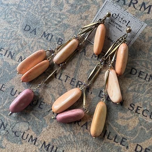 草木染めのボーンパーツを長さ違いで組んだ耳飾り。
